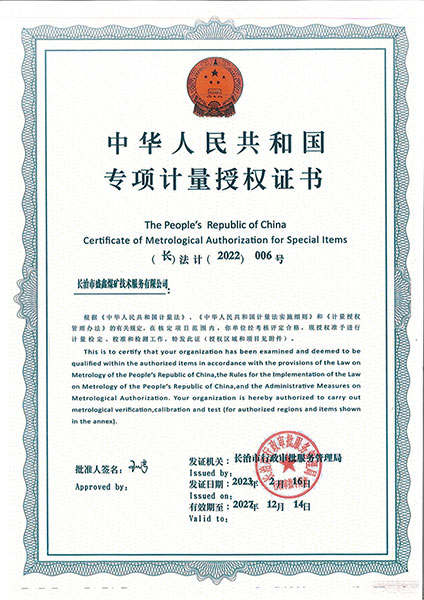 • 專項(xiàng)計(jì)量授權(quán)證書